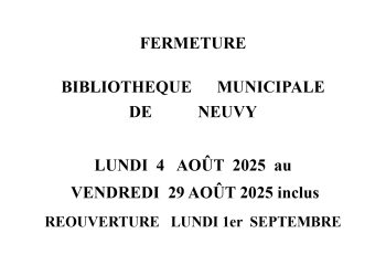 La Bibliothèque Municipale de Neuvy sera fermée du lundi 04 août au vendredi 29 août 2025 inclus.... Read More FERMETURE BIBLIOTHÈQUE MUNICIPALE