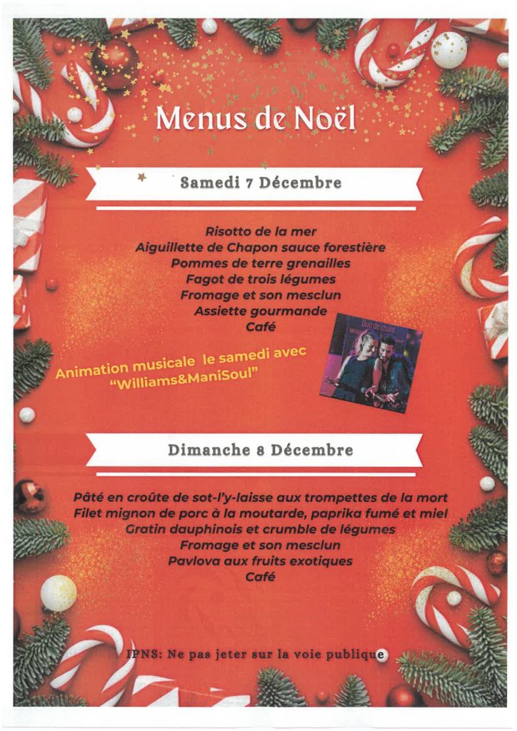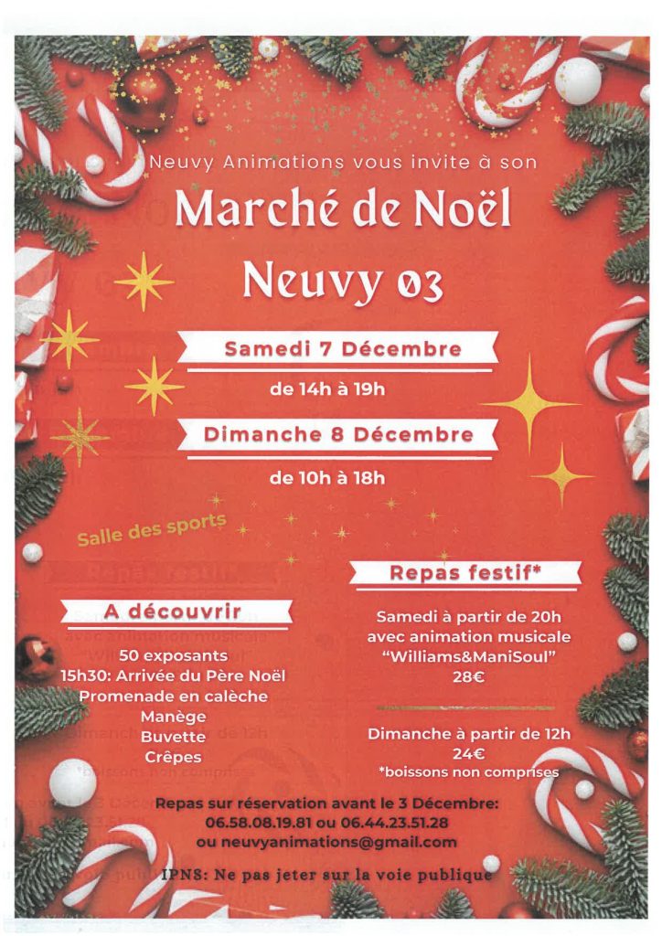 Réservation pour les repas avant le 03 décembre au 06.58.08.19.81 ou 06.44.23.51.28 ou neuvyanimations@gmail.com