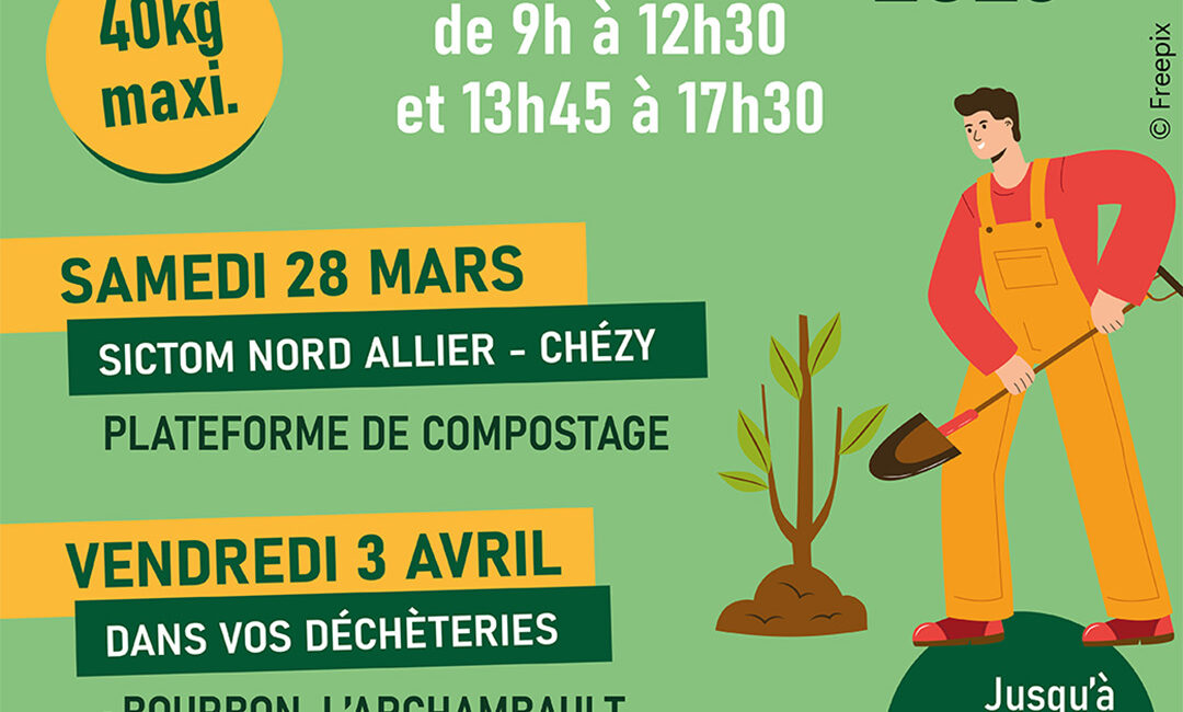 Le SICTOM Nord Allier propose, à l’ensemble de ses usagers, une distribution gratuite de compost sur la Plateforme de Compostage des Déchets Verts de Chézy le samedi 28 mars 2026 et dans les déchèteries de Bourbon l’Archambault, Lurcy-Lévis et Neuilly-le-Réal le vendredi 03 avril 2026.