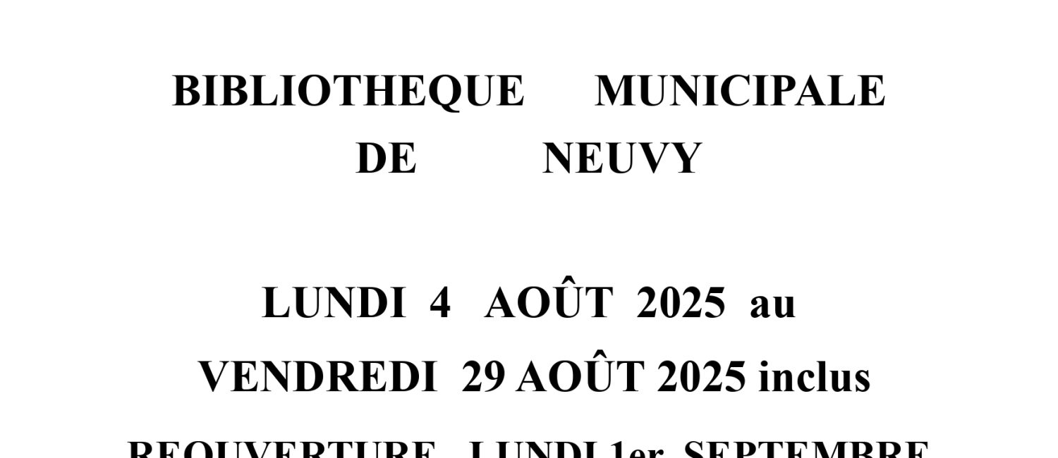 La Bibliothèque Municipale de Neuvy sera fermée du lundi 04 août au vendredi 29 août 2025 inclus.