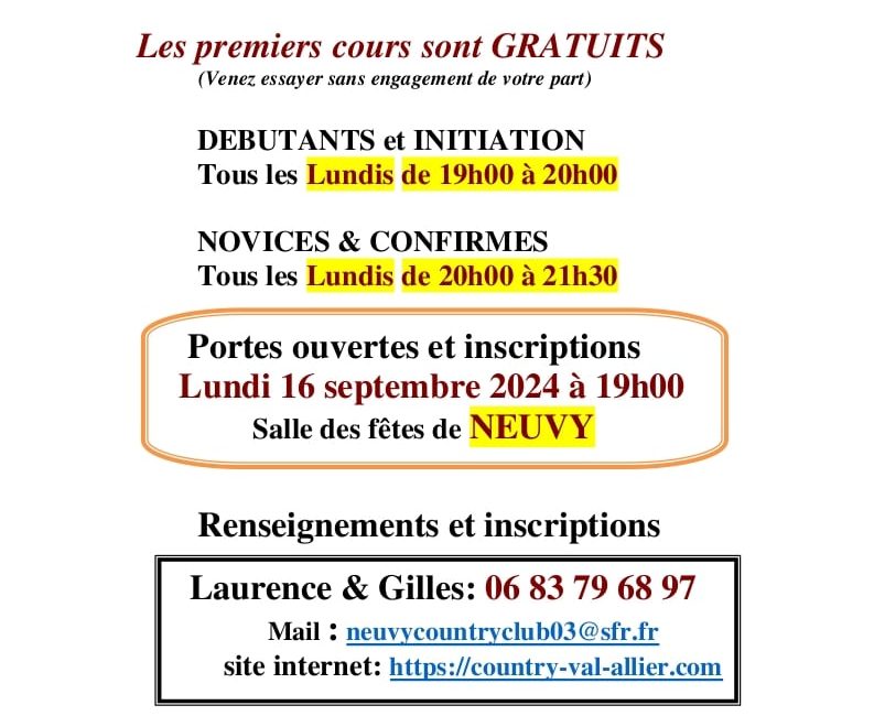 Laurence Lepée et Gilles Lager assurent les cours à Neuvy. Rendez-vous tous les lundis à la salle des fêtes de Neuvy avec l’association Neuvy Country Club de 19 heures à 20h00 pour les danseurs débutants et de 20h00 à 21h30 pour les danseurs déjà initiés, les 2 premiers cours étant gratuits, vous pouvez venir essayer sans vous engager.